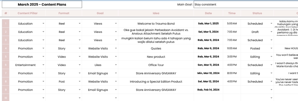 Content Planner Berbagai Jenis Usaha Dalam 30 Hari (Ide Fresh, Tema Unik, Original, Viral)