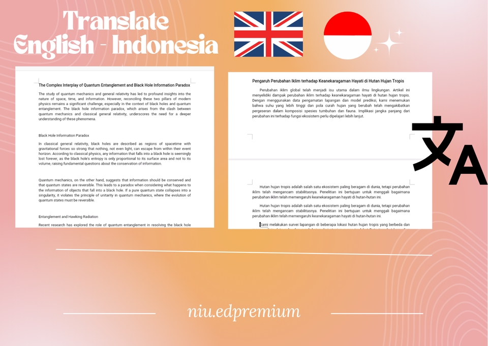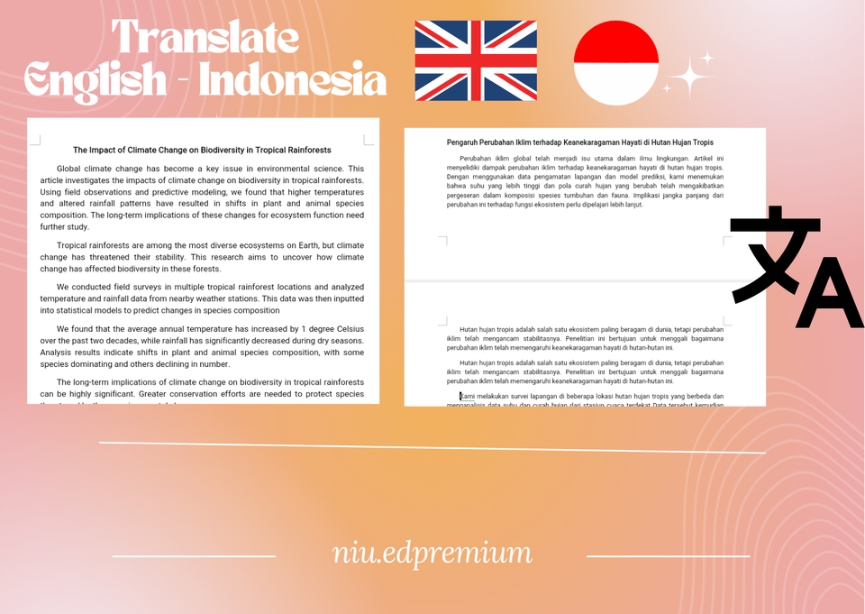 Rp200,0 rbLayanan penerjemahan saya mencakup: ( layanan per halaman maksimal 500 kata) 1. Penerjemahan Teks Umum: Surat, artikel, laporan, dan dokumen lainnya. 2. Penerjemahan Bisnis: Proposal, presentasi, dokumen kontrak, dan komunikasi bisnis lainnya. 3. Penerjemahan Situs Web: Menghadirkan situs web Anda dalam bahasa Indonesia untuk menjangkau audiens lokal. 4. Penerjemahan Teknis: Manual, spesifikasi, dan dokumentasi teknis 5. Penerjemahan Akademis: Makalah, jurnal, dan materi akademis lainnya.