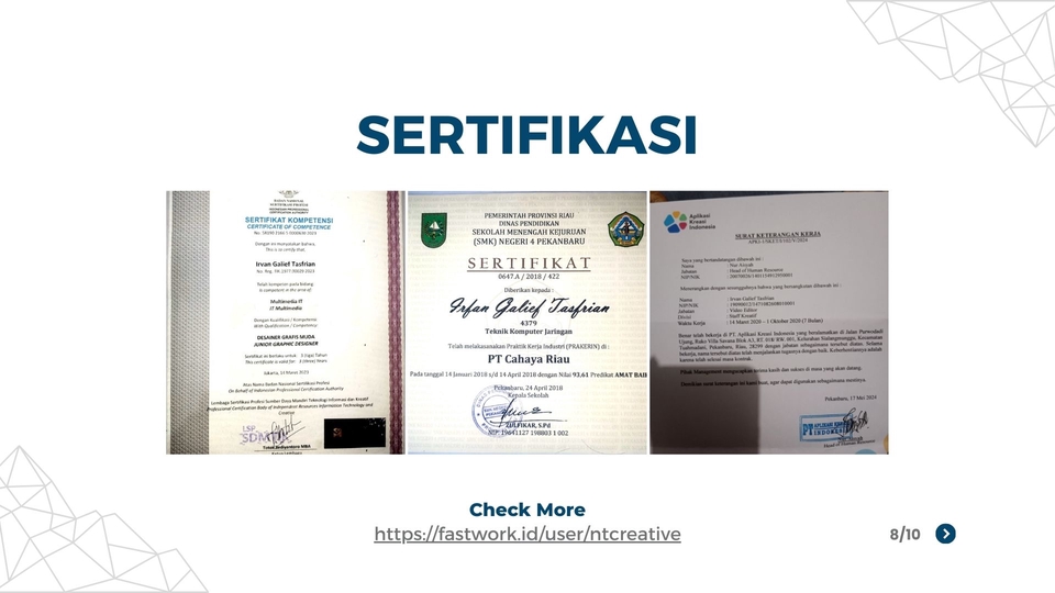 Halo! Saya Irvan, seorang Graphic Designer yang berdedikasi dan berpengalaman dengan mata tajam untuk detail dan kecintaan terhadap kreativitas. Dengan pengalaman lebih dari 3 tahun di bidang ini, saya mengkhususkan diri dalam menciptakan desain visual yang menarik yang mampu menyampaikan pesan secara efektif dan melibatkan audiens. Langkah Pekerjaan 1. 1. Briefing dan Pengumpulan Informasi 2. 2. Riset dan Inspirasi 3. 3. Konseptualisasi dan Brainstorming 4. 4. Pembuatan Draft Awal 5. 5. Presentasi dan Umpan Balik 6. 6. Penyempurnaan Desain 7. 7. Finalisasi dan Pengiriman