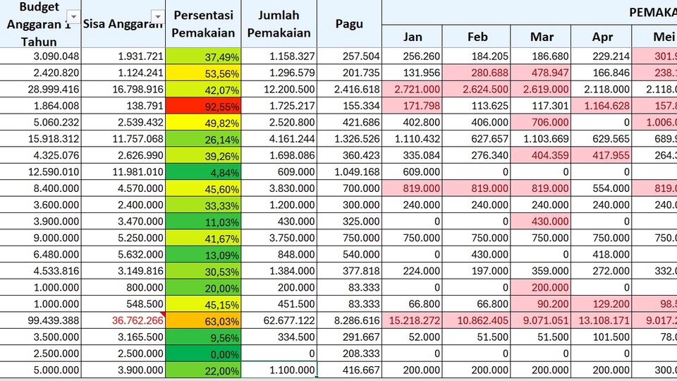 membuat suatu data yang berisikan rekap transaksi suatu divisi yang dapat dilihat secara detail lengkap dengan monitoring sisa anggaran, pemakaian anggaran, dan biaya pemakaian yang telah lebih dari pagu yang disepakati di awal, serta ada persentase sebagai pengingat apabila anggaran semakin menipis. Langkah Pekerjaan 1. Membuat perencanaan target dari output 2. Mengumpulkan data 3. Mengolah data 4. Menyesuaikan dengan output yang diinginkan