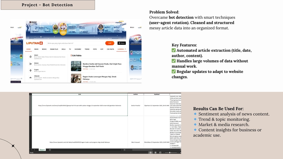 Layanan Web Scraping & Automasi Data dari Berbagai Website. Data Atau Informasi dapat berupa text, gambar dan kebutuhan lainnya. Output berupa : ✅ File Excel (.xlsx), .csv , atau Google Sheets Cocok untuk kebutuhan riset pasar, monitoring harga, analisis sentimen, e-commerce, maupun pembuatan laporan. Sebelum Kesepakatan, anda dapat melakukan konsultasi apapun, GRATIS Sampai Deal. Ayo, Klik "Chat dan Nego" sekarang! Langkah Pekerjaan 1. Konsultasi Awal – memahami kebutuhan dan tantangan Anda 2. Rencana & Alternatif Solusi – menawarkan opsi terbaik sesuai tujuan 3. Brief & Paket Kerja – memastikan semua detail jelas dan disepakati 4. Eksekusi Proyek – mulai proses 5. Update Harian – laporan progress, tantangan, dan langkah berikutnya 6. Quality Check – pembersihan data & persiapan agar siap digunakan 7. Hasil Akhir & Revisi – serah terima output dan penyesuaian jika diperlukan Project Close