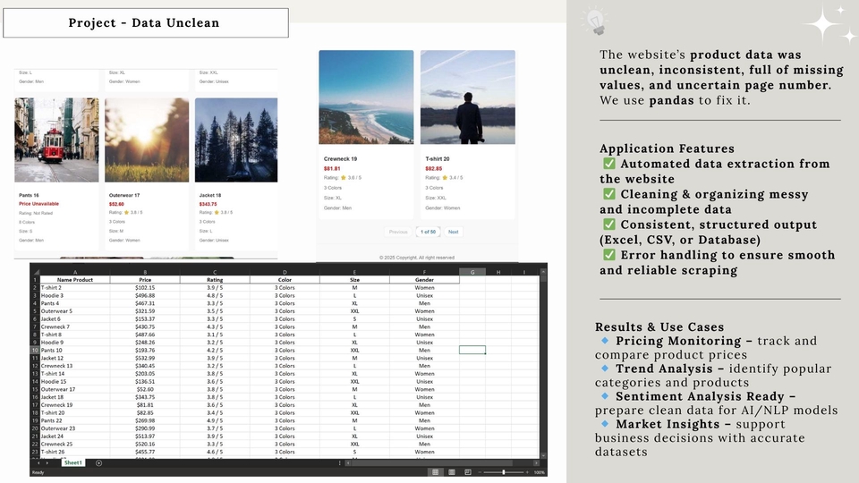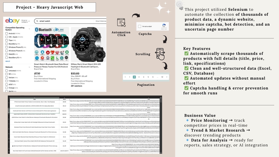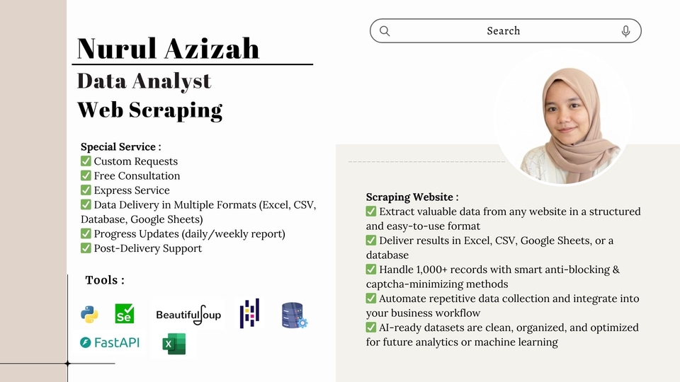 I’m a Data Analyst & Web Scraper who helps businesses turn raw data into clear, structured, and actionable insights. I can scrape data from e-commerce, social media, news sites, or company websites, then clean, organize, and deliver it in Excel, CSV, or databases. I focus on accuracy, efficiency, and clear communication so you get reliable data that actually supports your business decisions.