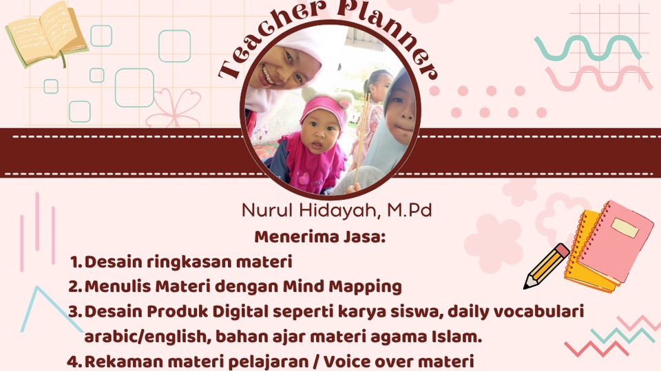 saya seorang Teacher Planner, Desain Materi Pelajaran dengan Mind Mapping, Desain Materi Presentasi Pelajaran, Merangkum Materi Pelajaran sesuai dengan Kisi-kisi yang diberikan. saya telah bergabung selama 5 tahun dalam dunia pendidikan dan pengalaman menulis dapat di baca dalam platform KBM Mahir dalam canva, WordPress, merangkum materi pelajaran dalam bentuk listening/Over Voice materi. Sebelum order jasa saya berharap klien memberikan informasi atau draft materi pelajaran yang diinginkan dan dalam menjelaskan dalam bentuk listening, mind mapping atau power point presentasi. Setelah produk jadi akan kami kirimkan dan menambahkan 1 kali masukan yang diinginkan. Persyaratan dari saya sederhana yakni Tidak menerima proyek yang terkait dengan materi atau konten pornografi, memiliki unsur sara, partai atau berbentuk pemahaman radikal.