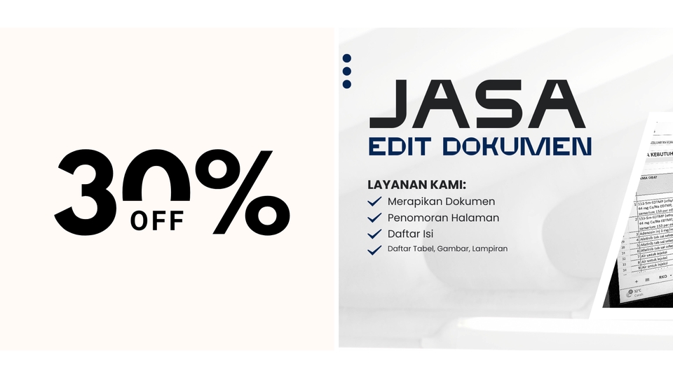 Menerima Jasa Edit Dokumen (Skripsi, Tesis, Proposal) meliputi : Merapikan Dokumen Membuat Daftar Tabel, Gambar, Lampiran Membuat Penomoran Halaman Membuat Daftar Isi DLL Langkah Pekerjaan 1. Order melalui chat 2. Setelah admin merespon maka jelaskan ingin mengedit dokumen seperti apa 3. Ketika sudah jelas, kirim file dalam bentuk WORD 4. Maka admin akan memproses dokumen tersebut 5. Setelah selesai maka admin akan mengirimkan kembali