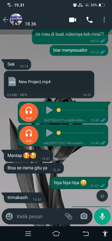 saya sudah berpengalaman dubbing suara karna itu saya yakin rekan sekalian dapat menggunakan jasa saya. full servis jadi di jamin aman ygy. pekerjaan akan selesai pada waktunya Langkah Pekerjaan 1. kirim teks yang akan di doobing 2. kemudian akan saya kirim rekaman dan bisa di koreksi dahulu