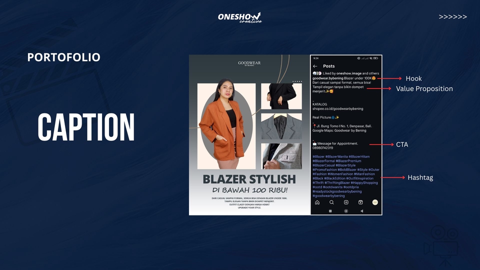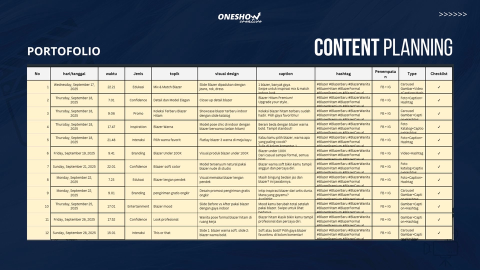 Kami dari Oneshow Creative sudah berpengalaman selama 5 tahun membuat konten media sosial, content planning, caption dan strategi konten. Sudah banyak UMKM yang kami pegang untuk mengelola social media agar lebih terarah dan engagement konsisten. Langkah Pekerjaan 1. Klien memberikan tahu tentang detail pekerjaan: niche Instagram, konten seperti apa yang ingin dibuat. 2. Mendiskusikan waktu pengerjaan atau tenggat waktu (deadline). 3. Mendiskusikan harga final. 4. Jika klien telah menyepakati tentang deadline dan harga, klien melakukan pembayaran. 5. Proses pengerjaan, selama proses ini Anda boleh sembari berdiskusi. 6. Penyerahan hasil pekerjaan, maksimal revisi yang dapat diberikan hanya 1 kali revisi. 7. File dikirim format pdf.