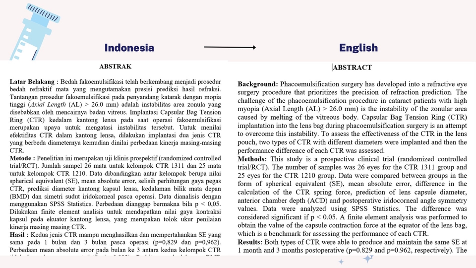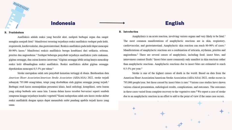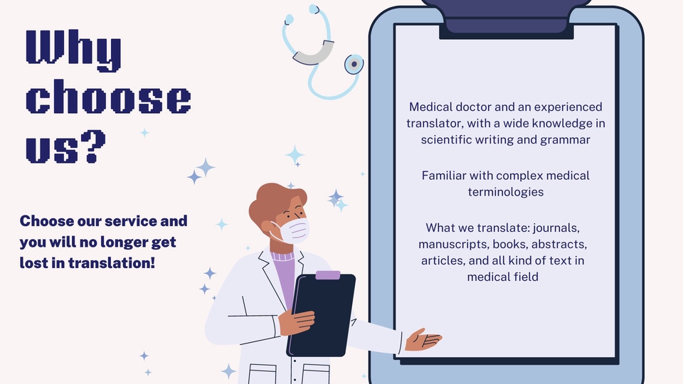 Translator English-Indonesia dan Indonesia-English. Menerima translate jurnal, artikel, atau buku kedokteran. Lulusan FK Universitas Airlangga. Berpengalaman selama 5 tahun di bidang translation