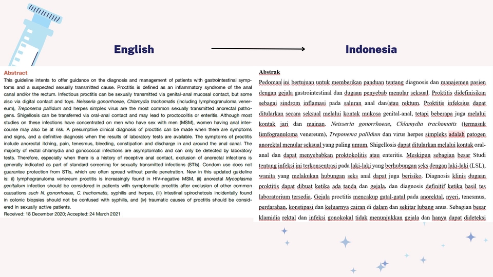 Dengan pengalaman lebih dari 5 tahun dalam dunia kedokteran dan translation, saya memastikan terjemahan yang tepat, akurat, dan sesuai dengan terminologi medis yang kompleks. Layanan yang tersedia mencakup terjemahan artikel, jurnal, tugas ilmiah, buku, abstrak, makalah penelitian, dan lain-lain. Menerima translate Indonesia-Inggris maupun Inggris-Indonesia. Penghitungan jumlah halaman dihitung berdasarkan halaman hasil translate dan hasil akan dikirim dengan format word: Font: times new roman size 12 Spasi: 1,5 Ukuran: A4 Margin: 2,54 Langkah Pekerjaan 1. Diskusi detail pekerjaan 2. Kirim file 3. Proses pengerjaan 4. Pengiriman hasil 5. Pengecekan hasil oleh customer