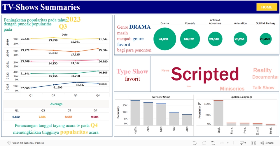 Saya menawarkan layanan visualisasi data untuk bisnis anda. Saya memiliki latar belakang yang kuat dibidang sains data dengan keunggulan utama di visualisasi dan analisis data untuk membantu memberikan keputusan bisnis. Alat atau tools yang saya gunakan untuk visualisasi sangat beragam mulai dari excel hingga tableau. Tidak hanya visualisasi data, saya juga menawarkan simpulan, actionable insight, dan key point dari data jika diperlukan untuk bisnis anda.