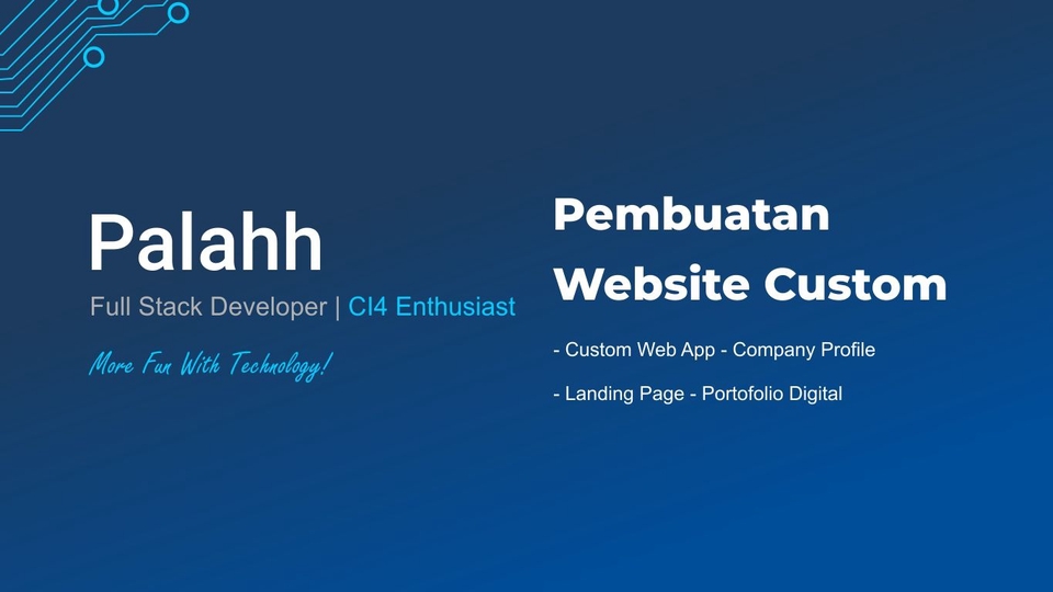 Saya Nurpalah, full-stack developer dengan pengalaman dalam mengembangkan Web App Kustom yang cepat dan andal, built menggunakan CodeIgniter 4 (CI4). Silahkan mengunjungi website saya untuk melihat portofolio secara lengkap di palah.web.app Kategori pembuatan website yang saya sediakan : - Custom Web App - Company Profile - Landing Page - Portofolio Digital Apa yang akan anda dapatkan : - Source code lengkap - Bantuan pemasangan website ke hosting - Optimasi SEO setiap page Catatan : - Hanya melayani pembuatan website dari awal - Tidak melayani pembuatan website illegal Langkah pekerjaan : - Mendiskusikan proyek web yang akan dibuat - Client memberikan materi berupa design & copywriting - Membuat kesepakatan harga dan membuat penawaran kerja - Setelah client melakukan pembayaran, developer memulai pembuatan web - Client menerima hasil preview dalam jangka waktu yang ditentukan - Melakukan revisi jika diperlukan - Menyerahkan source code dan membantu pemasangan website ke hosting client Silahkan chat saya, mari diskusikan proyek Anda. Terimakasih!