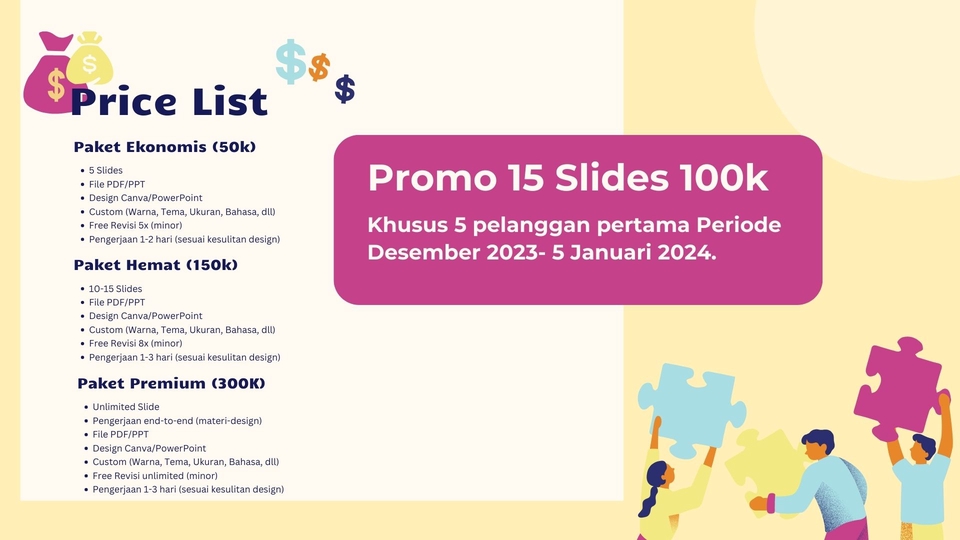 Rp100,0 rbPromo 15 slides 100k khusus 5 pelanggan pertama periode Desember 2023 - 5 Januari 2024. - 10-15 Slides - File PDF/PPT - Free Revisi 8x (minor) - Design Canva/Power Point pilih salah satu - Custom (warna, tema, ukuran, bahasa, dll) - Pengerjaan 1-3 hari (sesuai kesulitan design)