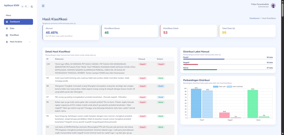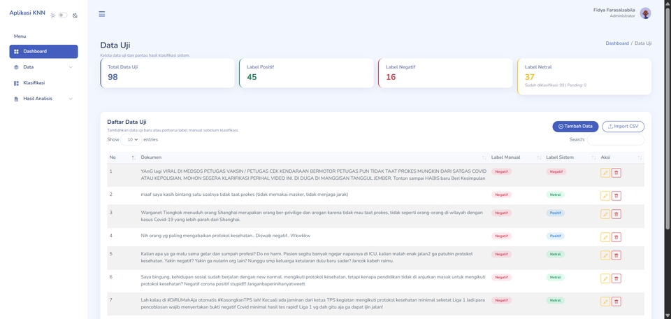Aplikasi ini merupakan sistem web lokal interaktif untuk melakukan analisis data dan klasifikasi teks menggunakan algoritma K-Nearest Neighbors (KNN). Dibangun dengan tampilan modern (tersedia dalam mode gelap dan terang), aplikasi ini dirancang untuk memudahkan pengguna dalam memantau, menguji, dan menganalisis performa model klasifikasi secara real-time. Spesifikasi dan Fitur Utama: -Dashboard interaktif menampilkan data latih, data uji, nilai K aktif, dan akurasi terkini -Visualisasi tren akurasi per nilai K untuk evaluasi performa model -Distribusi label data dalam bentuk grafik pie interaktif -Pengaturan nilai K langsung melalui antarmuka aplikasi -Riwayat pengujian lengkap (akurasi, benar, salah, dan waktu pembaruan) -Tampilan responsif dengan mode gelap dan terang -Dijalankan secara lokal tanpa koneksi internet (XAMPP) -Front End HTML, CSS, dan JavaScript Cocok Digunakan Untuk: -Analisis sentimen dan klasifikasi teks -Penelitian atau proyek tugas akhir (skripsi) NLP & Machine Learning -Eksperimen parameter KNN untuk pembelajaran data -Visualisasi hasil klasifikasi secara cepat dan interaktif Langkah Penerimaan Proyek: 1. Diskusi 2. Lakukan Pembayaran 3. Pengiriman dan instalasi proyek 4. Revisi 5. Pengiriman hasil revisi proyek 6. Konfirmasi kelengkapan dan penyelesaian proyek 7. Proyek Selesai