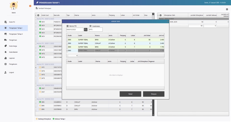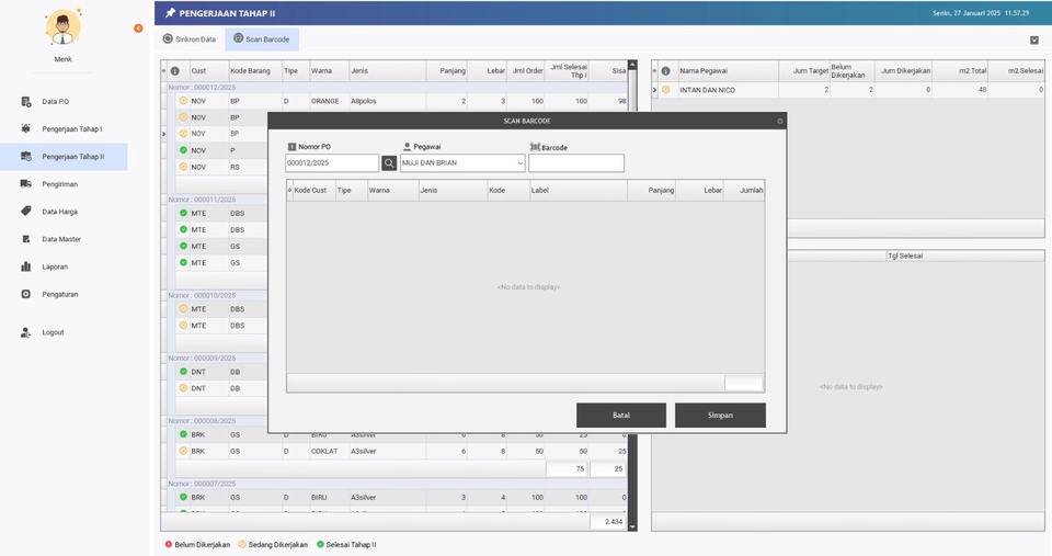 1. Aplikasi Melakukan proses Pre Order (PO) 2. Aplikasi dapat mencetak BARCODE 3. Proses pencatatan Pengerjaan di tahap satu 4. Proses pencatatan pengerjaan tahap dua 5. proses pengiriman 6. kumpulan report Langkah Pekerjaan 1. 1. Diskusi detail aplikasi yang diinginkan 2. 2. Penentuan biaya dan lama pengerjaan 3. 3. Jika deal, lanjut ke proses pengerjaan aplikasi 4. 4. Review / Testing 5. 5. Finish