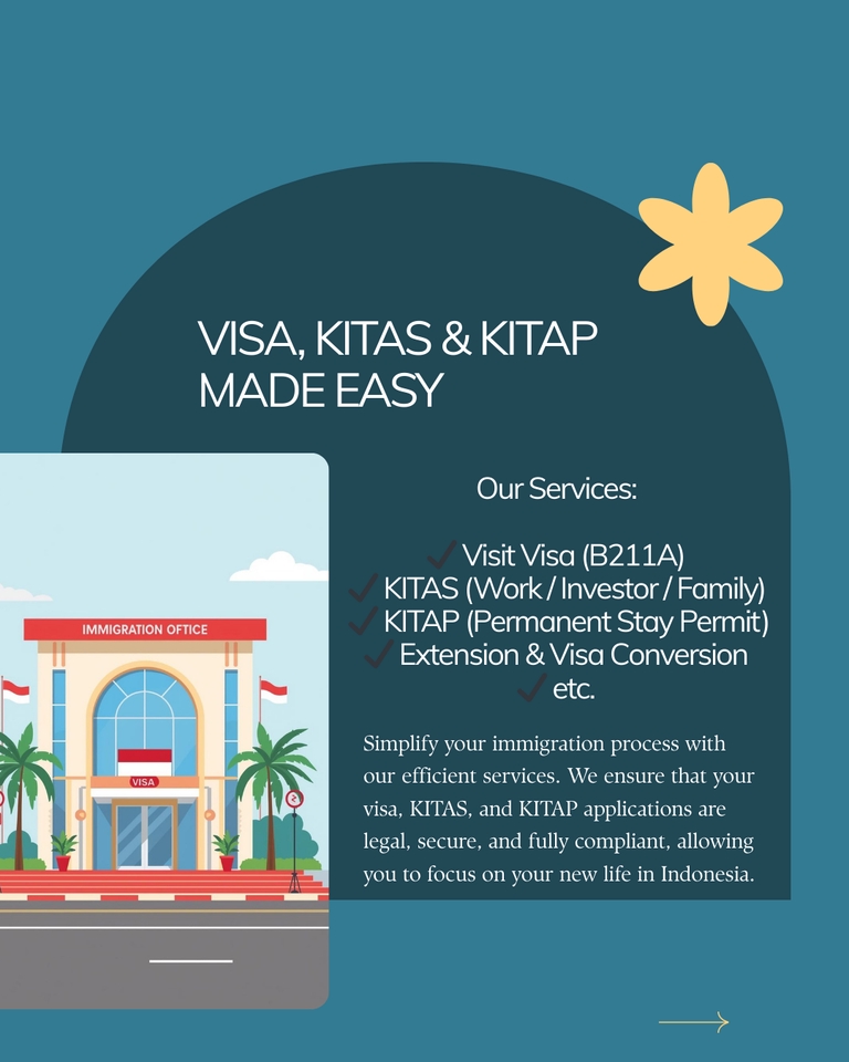 Bahasa Indonesia: Kami membantu Warga Negara Asing dan perusahaan mengurus Visa, KITAS, dan KITAP di Indonesia dengan proses yang cepat, jelas, dan sesuai regulasi imigrasi. Dapatkan pendampingan dari awal hingga selesai tanpa ribet dan tanpa risiko salah prosedur. English Version: We assist foreigners and companies with Visa, KITAS, and KITAP applications in Indonesia through a clear, efficient, and fully compliant process. Enjoy end-to-end support with minimal hassle and maximum peace of mind.