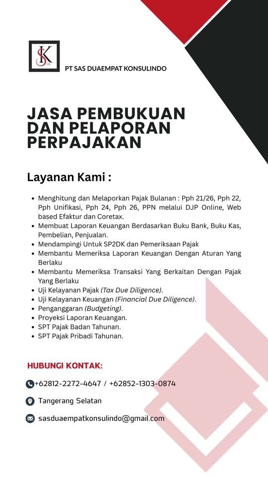 - Menghitung dan Melaporkan Pajak Bulanan : PPH 21/26, PPH 22, PPH Unifikasi, PPH 24, PPH 26, PPN melalui DJP Online, Web Efaktur, Desktop Efaktur dan Coretax. - Membuat Laporan Keuangan Berdasarkan Buku Bank, Buku Kas, Pembelian dan Penjualan. - Mendapingin Untuk SP2DK dan Pemeriksaan Pajak - Membantu Memeriksa Laporan Keuangan Dengan Aturan Yang Berlaku - Membantu Memeriksa Transaksi Yang Berkaitan Dengan Pajak Yang Berlaku - Uji Kelayakan Pajak ( Tax Due Diligence/Tax Compliance) - Uji Kelayakan Keuangan (Financial Duediligence) - Penganggaran (Budgeting) - Proyeksi Laporan Keuangan - SPT Pajak Badan Tahunan - SPT Pajak Orang Pribadi Tahunan