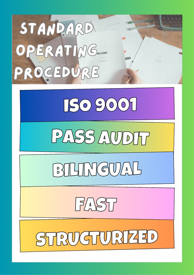 Menerima pembuatan SOP sesuai standar pembuatan dokumen untuk keperluan audit (ISO). Terbiasa membuat SOP di multinasional FMCG company untuk keperluan operasional sehari-hari maupun untuk kebutuhan audit. Langkah Pekerjaan 1. User mengirimkan konten SOP yang akan dibuat, termasuk flowchart jika ada 2. Seller akan membuat draft dalam bentuk pdf 3. Review draft oleh klien 4. Jika ok, seller akan mengirimkan hasil SOP dalam bentuk pdf.