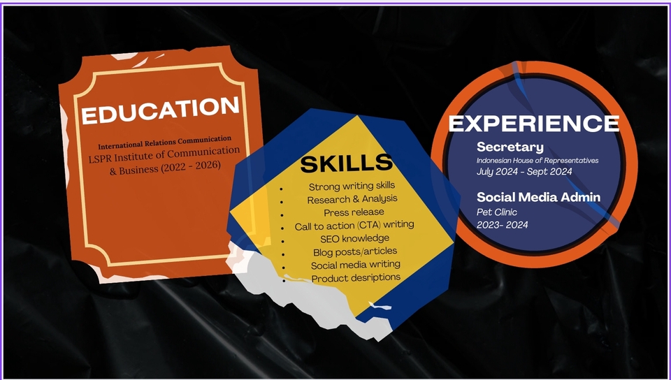 An organize and motivated student majoring in International Relations Communication at LSPR Institute of Communication and Business. Have 5 years experience using Docs, Spreadsheet, Gmail, and Canva. Have excellent communication both writing and verbal communication. Have experience before being Project Officer, Operational Team, Administrator, and Secretary.