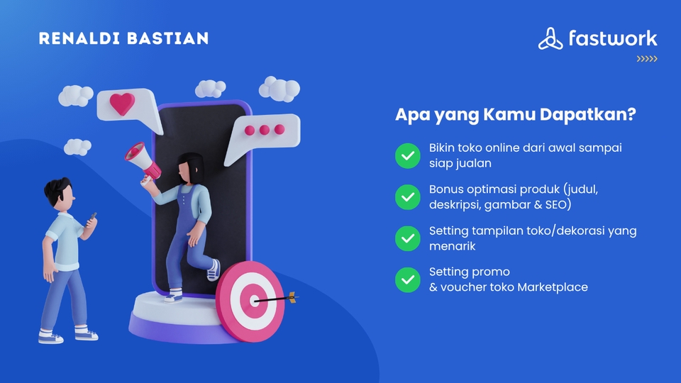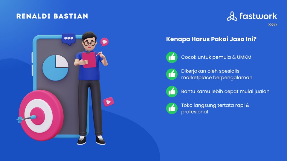 Baru mau mulai jualan di marketplace tapi bingung mulainya dari mana? Atau pusing lihat menu seller center yang ribet? Tenang, biar saya yang pusing, kakak terima beres. Saya bantu bangun toko kakak dari nol sampai rapi, profesional, dan siap jualan. Standar tampilannya nggak main-main, saya buatkan sekelas "Official Store" atau toko-toko di Mall biar pembeli langsung percaya pas pertama lihat. Apa Saja yang Saya Bereskan? 1. Tampilan Toko: Profil lengkap, logo (kalau belum ada, saya buatkan khusus marketplace), dan banner toko yang keren. 2. Isi Toko (Etalase): Kategori saya susun rapi biar pembeli gampang cari barang. 3. Upload Produk: Judul saya bikin rapi, deskripsi enak dibaca, dan foto disusun yang pas. 4. Setting Promo: Voucher atau diskon awal saya pasangkan sekalian. 5. Desain: Dapat template desain biar tampilan produk seragam dan rapi. Platform yang Saya Kerjakan: Shopee, TikTok Shop, Tokopedia, Lazada, atau Blibli. Agar pengerjaan cepat, kakak cukup siapkan data ini: Nama produk & Harga jual. Varian (Warna/Ukuran) & Stok. Foto produk (Minimal 3-5 foto per barang). Info detail (Bahan, ukuran, keunggulan). Format dalam Excel/Google Sheet paling enak Paket dibedakan berdasarkan seberapa "Wah" tampilan akhirnya, bukan cuma jumlah produk. Kuota produk fleksibel, kalau kurang bisa tambah Add-on Kalau produk kakak lebih banyak dari kuota paket, bisa tambah eceran: +10 Produk: Rp150.000 +25 Produk: Rp325.000 Biaya ini sudah termasuk jasa upload, merapikan judul, deskripsi, dan atur foto