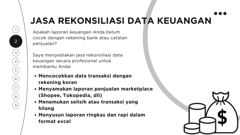 Apakah laporan keuangan Anda belum cocok dengan rekening bank atau catatan penjualan ? Saya menyediakan jasa rekonsiliasi data keuangan secara profesional untuk membantu Anda: - Mencocokkan data transaksi dengan rekening koran - Menyamakan laporan penjualan marketplace (Shopee, Tokopedia, dll) dengan laporan keuangan internal - Menemukan selisih atau transaksi yang hilang - Menyusun laporan ringkas dan rapi dalam format Excel Berpengalaman sebagai profesional rekonsiliasi data selama lebih dari 4 tahun, serta saat ini bekerja sebagai Finance Accounting. Langkah pekerjaan Jasa Rekonsiliasi Data Keuangan cocok untuk UMKM Pebisnis Online : 1. Klien menghubungi freelancer 2. Klien menjelaskan detail pekerjaan kepada freelancer 3. Klien menetapkan batas pengerjaan untuk freelancer 4. Freelancer membuat penawaran dan klien meninjau penawarannya 5. Klien melakukan pembayaran dan freelancer melakukan pekerjaan setelahnya 6. Freelancer mengirim hasil pekerjaan dan klien melihat kembali hasil pekerjaan freelancer 7. Klien mengajukan revisi (jika ada) pada freelancer Langkah Pekerjaan 1. Klien menghubungi freelancer 2. Klien menjelaskan detail pekerjaan kepada freelancer 3. Klien menetapkan batas pengerjaan untuk freelancer 4. Freelancer membuat penawaran dan klien meninjau penawarannya 5. Klien melakukan pembayaran dan freelancer melakukan pekerjaan setelahnya 6. Freelancer mengirim hasil pekerjaan dan klien melihat kembali hasil pekerjaan freelancer 7. Klien mengajukan revisi (jika ada) pada freelancer