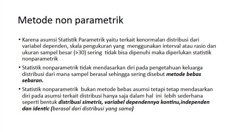 Mencakup Uji Binomial, Uji mc nemar, Uji cox struart, Uji wilcoxon, Uji Mann whitney, Uji kruskal wallish, koef korelasi spearman, korelasi data kualitatif, korelasi tau kendall, Uji friedman, Uji jonckhere terpstra, Uji page, Uji durbin, Uji cochran Q, Uji keselarasan kai kuadrat, Uji kolmogorov smirnov satu sampel atau dua sampel. bisa dihitung secara manual maupun menggunakan software SPSS dan Minitab
