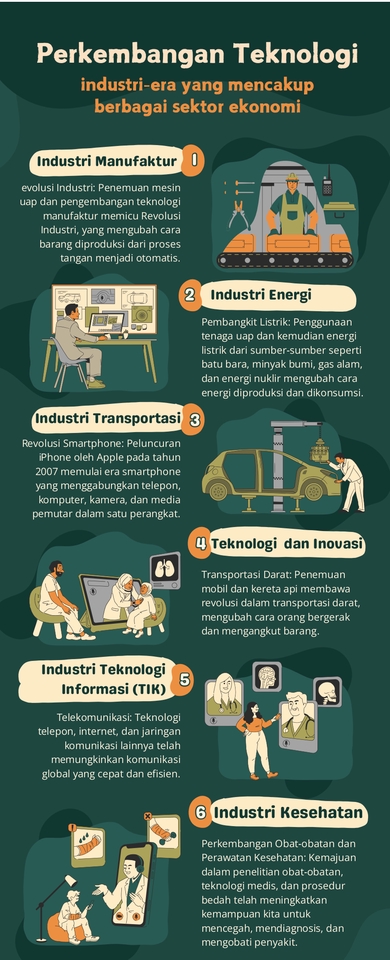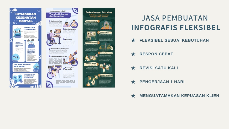 Melayani jasa pembuatan segala jenis infografis di berbagai bidang pekerjaan Keunggulan 1. Respon cepat & ramah 2. Harga bersaing 3. Revisi 2x 4. Pengerjaan cepat namun tepat Langkah Pekerjaan 1. Pemesanan 2. Diskusi konsep yang diinginkan 3. Negosiasi harga 4. Pembayaran penuh langsung 5. Pengerjaan proyek 6. Revisi (jika perlu)