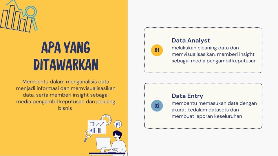 Saya Reza Prayoga, lulusan baru bidang Informatika dari Universitas Teknokrat Indonesia dengan IPK 3,70. Dengan dasar yang kuat dalam analisis data, saya telah mengembangkan kemahiran dalam pembersihan data, manipulasi, analisis statistik, dan visualisasi menggunakan alat seperti Python, SQL, Tableau, dan Power BI. Pengalaman saya mencakup pembuatan model pembelajaran mesin untuk pengelompokan dan klasifikasi, serta memanfaatkan teknik pemrosesan bahasa alami (NLP) untuk mengekstrak wawasan dari data tidak terstruktur. Saya bersemangat menggunakan pendekatan berbasis data untuk memecahkan masalah dan membantu bisnis membuat keputusan yang tepat. Langkah Pekerjaan 1. Client memberikan data yang akan diproses 2. Pekerja akan melakukan analisis dan visualisasi data 3. Pekerja akan memberikan insight pada saat yang sudah diproses dan divisualisasi 4. Client akan menerima slide dan informasi visualisasi data