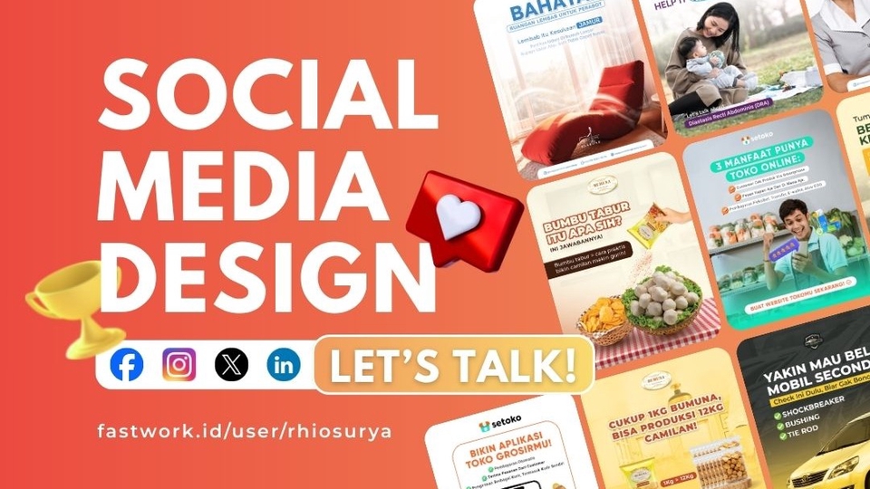 Pengen brand kamu lebih standout, gampang diingat, dan punya reputasi yang kuat? Desain yang cantik dan tertarget itu kuncinya! Aku siap bantu dengan Branding Sosial Media biar bisnis kamu makin berkembang dan menarik banyak pelanggan. ✨ Kenapa Harus Pilih Aku? ✅ Bikin brand kamu lebih dikenal dengan desain yang unik & profesional, ✅ Meningkatkan kepercayaan dan daya ingat audiens terhadap brand kamu, ✅ Visual yang menarik buat ningkatin engagement dan interaksi. Aku desainer dengan pengalaman lebih dari 5 tahun di bidang desain dan sosial media. Yuk, kita bikin brand kamu makin dikenal dan menarik banyak pelanggan! Langkah Pekerjaan 1. Briefing: Klien menyediakan brief yang jelas dan detail 2. Research: Designer mulai riset dan mendesain 3. Design: Mendesain sesuai brief dan kesepakatan 4. Delivery: Memberikan hasil desain kepada klien