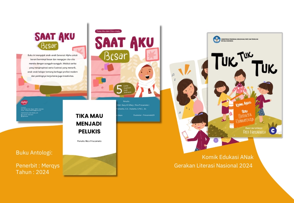 Saya Rica Friscarnela, seorang ilustrator yang berasal dari Bogor, Indonesia. saya memiliki pengalaman sebagai ilustrator selama 2 tahun. saya akan menggambar halaman buku anak-anak, kemasan, merchandise, atau sampul buku yang aneh, cerah, dan berwarna-warni untuk Anda.