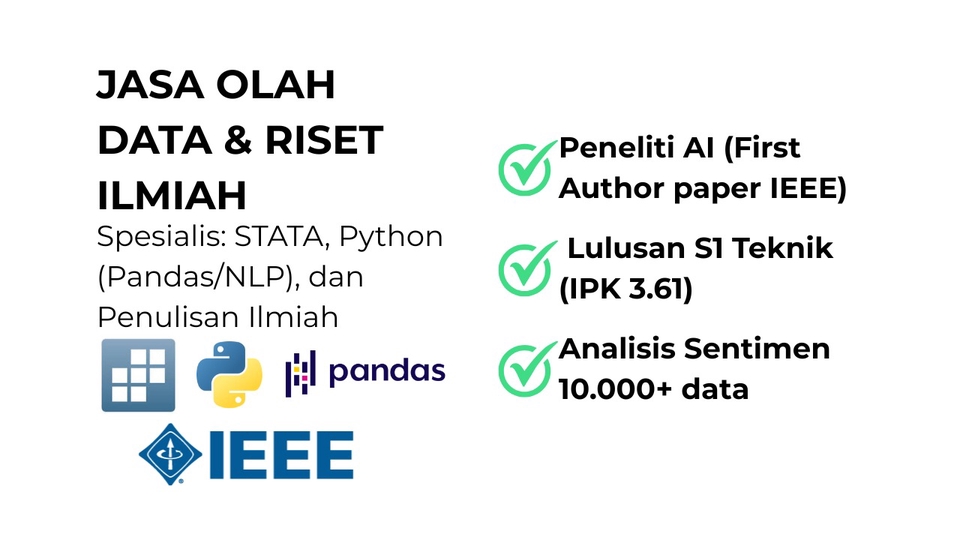 Anda seorang Peneliti, Analis Bisnis, atau Akademisi yang "mentok" di olah data? Punya data mentah tapi bingung cara menganalisisnya, atau butuh bantuan scraping data? Saya di sini untuk membantu. Saya Rifki, seorang Lulusan S1 Teknik (IPK 3.61) dan Peneliti AI (First Author paper IEEE). Saya bukan sekadar "bisa" olah data, saya adalah seorang praktisi riset profesional. 🔹 Ruang Lingkup Pekerjaan Saya menyediakan jasa analisis dan olah data kuantitatif secara end-to-end. - Olah Data Statistik (Stata/Python): Menjalankan uji statistik (Uji T, Regresi, Anova, dll) menggunakan Stata 17 atau Python (Pandas/Scikit-learn). - Data Cleaning & Processing: Merapikan data mentah Anda (.csv, .xlsx) agar siap dianalisis. - Web Scraping / Data Collection: Mengumpulkan data dari web (seperti proyek EV Data atau proyek 10.000+ tweets saya). - Analisis NLP (Text Analytics): Melakukan analisis sentimen atau text mining (seperti proyek saya). - Bimbingan & Konsultasi Riset: Membantu Anda merumuskan metodologi atau membaca hasil output statistik. 🔹 Pengalaman & Keahlian - Kualifikasi Akademis: Lulusan S1 Teknik Telekomunikasi (IPK 3.61). - Kualifikasi Riset: First Author pada paper yang terbit di IEEE Xplore. Saya sangat paham metodologi riset dan penulisan ilmiah. - Kualifikasi Teknis (Software): Stata 17 (Ahli), Python (Ahli): Termasuk Pandas, Scikit-learn., NLP (Natural Language Processing) (Terbukti via proyek)., SQL. 🔹 Langkah Kerja 1. Konsultasi Gratis: Anda mengirimkan brief, pertanyaan riset, dan data mentah Anda (jika ada). 2. Penawaran: Saya akan menganalisis dan memberikan penawaran paket yang paling sesuai. 3. Eksekusi: Saya melakukan cleaning, scraping, atau analisis data. 4. Revisi: Saya mengirimkan hasil awal. Anda memberikan masukan. 5. Finalisasi: Saya mengirimkan output akhir (file data bersih, script, dan laporan/interpretasi hasil). 🔹 Persyaratan Yang Dibutuhkan Dari Klien - File data mentah (.csv, .xlsx, .dta, .sav) ATAU brief jelas tentang data apa yang perlu di-scrape. - Pertanyaan riset atau pertanyaan penelitian yang ingin dijawab. Jangan biarkan data Anda hanya "diam". Mari kita ubah jadi insight yang bernilai. Chat saya sekarang untuk konsultasi gratis!
