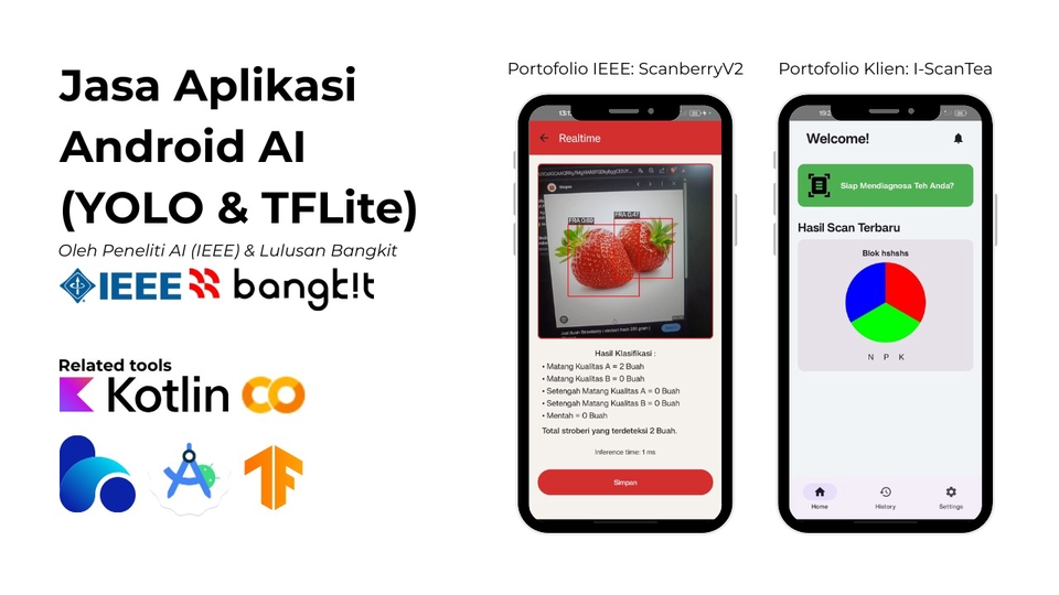 Anda seorang mahasiswa, peneliti, atau startup yang sudah punya model AI (YOLO/TFLite) tapi bingung cara mengubahnya menjadi Aplikasi Android yang nyata? Saya di sini untuk menjadi "jembatan" teknis Anda. Ruang Lingkup Pekerjaan - Saya spesialis dalam mengubah ide dan model AI Anda menjadi aplikasi Android (Kotlin/Compose) yang fungsional, modern, dan siap pakai. - Implementasi Model AI: Mengubah file model .tflite, .pt (YOLO), atau .onnx Anda menjadi fitur fungsional di dalam aplikasi. - Pembuatan Aplikasi AI End-to-End: Membangun aplikasi Android dari nol untuk kebutuhan image classification atau object detection. - Konsultasi & Bimbingan Skripsi: Bantuan teknis, code review, dan implementasi untuk mahasiswa (topik AI/Android). - Bug Fixing & Optimasi: Memperbaiki bug atau optimasi model TFLite yang lag di aplikasi Android Anda. Pengalaman & Keahlian - Saya bukan sekadar developer, tapi seorang Peneliti AI dan Spesialis Android. - Peneliti AI (IEEE): Saya adalah First Author pada paper IEEE yang dipublikasikan, dengan riset mendalam pada YOLO untuk deteksi objek real-time. - Spesialis Android (Bangkit): Saya Lulusan Bangkit Academy 2024 (Mobile Development Path), sehingga sangat menguasai Kotlin, Jetpack Compose, MVVM, Clean Architecture, dan Room DB. - Portofolio Terbukti (End-to-End): 1. "Scanberry" (Proyek IEEE): Membangun aplikasi deteksi stroberi dari riset model, deployment AWS, hingga aplikasi Android jadi. 2. "I-ScanTea" (Proyek Klien): Sukses mengimplementasikan model TFLite untuk klasifikasi penyakit daun teh untuk klien freelance. Langkah Kerja 1. Konsultasi Gratis, Anda mengirimkan brief, ide, atau file model (.tflite/dll). Kita diskusikan scope dan goals. 2. Penawaran, Saya mengirimkan penawaran paket harga dan timeline pengerjaan. 3. Development, Saya memulai pengerjaan, dari setup project, implementasi model, hingga layouting UI/UX. 4. Revisi, Saya mengirimkan APK demo untuk Anda tes. Anda memberikan masukan (sesuai paket). 5. Finalisasi, Saya mengirimkan final source code setelah proyek disetujui. Persyaratan Yang Dibutuhkan Dari Klien - File model AI yang sudah dilatih (.tflite, .pt, .h5, dll) ATAU Dataset gambar dan deskripsi jelas mengenai output yang diinginkan (jika model belum ada). - Desain UI/UX (jika ada). Jika tidak, akan saya buatkan desain yang bersih & fungsional. Syarat & Ketentuan - Harga belum termasuk biaya server/API (misal: AWS, Google AI). - Tidak mengerjakan proyek yang melanggar hukum atau plagiarisme. - File model AI yang diberikan dianggap sudah final. Retraining model akan ada biaya tambahan. Jangan biarkan model AI brilian Anda hanya tersimpan di file Colab. Chat saya sekarang untuk konsultasi gratis!