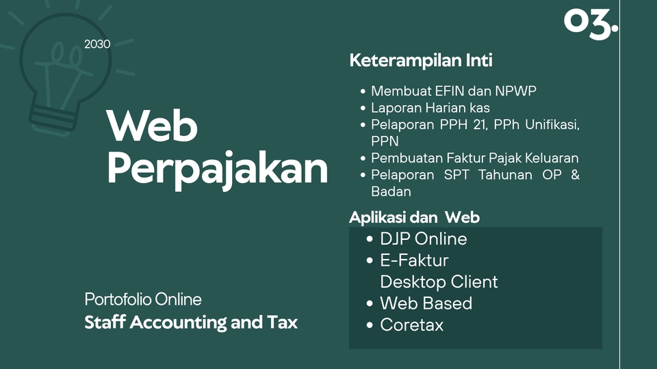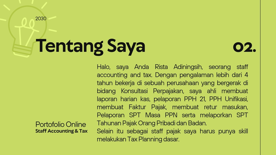 Saya berpengalaman sebagai Staff Tax selama 5 tahun di sebuah perusahaan yang bergerak dibidang Jasa Perpajakan.Memiliki kemampuan di bidang Tax Planning, Konsultasi Perpajakan demi mempermudah Wajib Pajak dalam memahami perpajakan usahanya.
