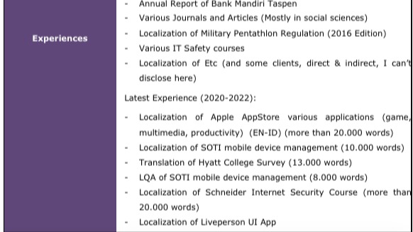 Saya mengambil konsentrasi linguistik di Prodi Bahasa dan Sastra Inggris UNY dan sudah menerjemahkan berbagai jenis teks sejak 2016, dari teks umum, penelitian, game, IT, hukum, dan medis. Pengalaman tersebut meyakinkan saya bahwa saya dapat menerjemahkan teks Anda dengan akurat dan cepat.