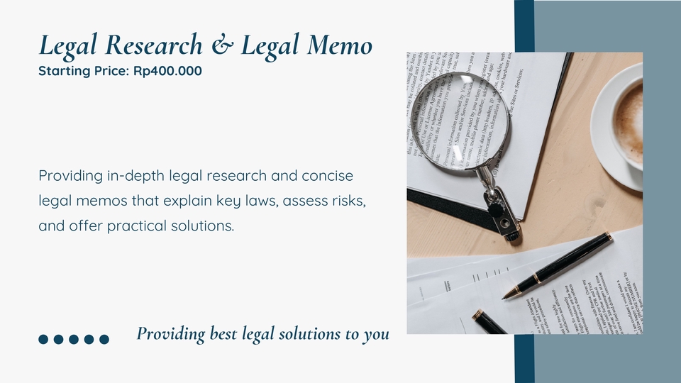 Seorang legal profesional yang memiliki pengalaman bekerja di salah satu law firm di Jakarta Selatan selama hampir 3 tahun. Selama menjadi associate, saya berpengalaman menangani berbagai macam proyek, seperti energi, kontruksi, industri, kesehatan, perizinan berusaha, dan korporat. Saya seorang yang detail dan bekerja dengan cepat dan tepat sesuai dengan deadline yang ditentukan.