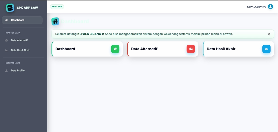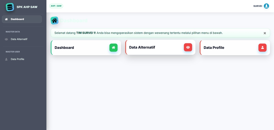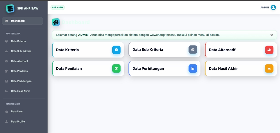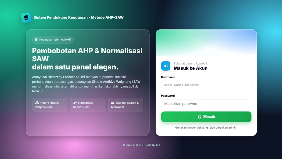 Pembobotan AHP & Normalisasi SAW dalam satu panel elegan. Analytical Hierarchy Process (AHP) menyusun prioritas melalui perbandingan berpasangan, sedangkan Simple Additive Weighting (SAW) menormalisasi nilai alternatif untuk menghasilkan skor akhir yang adil dan terukur. Tech Stack menggunakan PHP versi terbaru Fitur Pendukung - Multi Role - Management User - Cetak