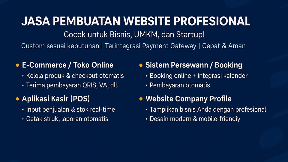 Ingin punya website keren untuk bisnis tapi bingung mulai dari mana? Tenang, kami siap bantu! Mulai dari toko online, sistem kasir, sampai booking online — semua bisa dibuat dan langsung terhubung dengan pembayaran otomatis. Cocok buat UMKM dan startup yang ingin naik level!