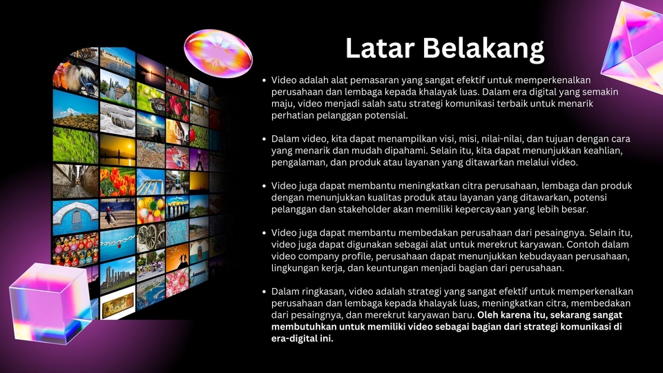 Memiliki tim yang lengkap dan mulai mengerjakan dari pra-produksi, produksi, hingga post-produksi. sudah berpengalaman hampir 8 tahun dan menghandle puluhan dari perusahaan swasta dan pemerintah. Langkah Pekerjaan 1. Diskusi terkait konsep video, lokasi, produksi, dan eksekusi produksi. 2. Menentukan tanggal produksi, melakukan produksi, dan tahap editing.