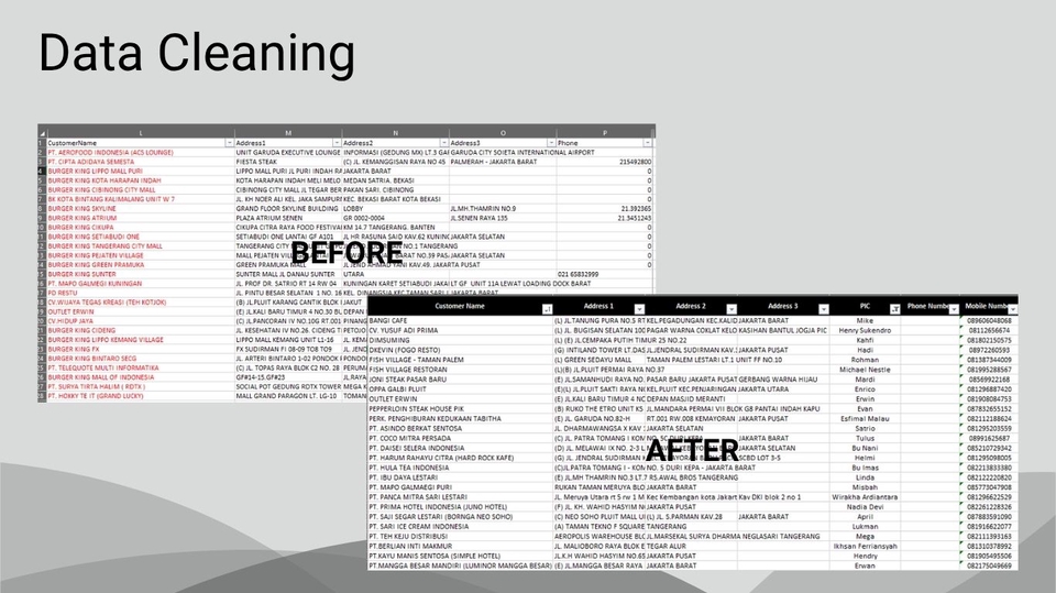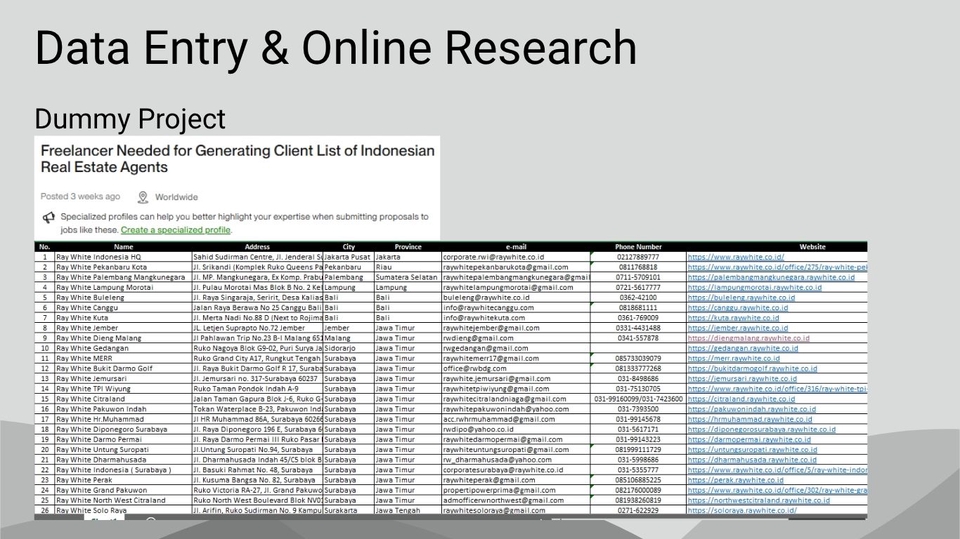 Menyediakan jasa pengolahan data: - Data entry - Online/Web research - Typewriting - Data cleaning - Convert data dari foto dan pdf ke Excel. Google Sheet, Word - Analisis data dan pembuatan laporan Tools yang digunakan: Microsoft Excel, Word, Google Sheet/Doc/Form Langkah Pengerjaan: 1. Diskusi mengenai detail pekerjaan 2. Negosiasi harga dan waktu pengerjaan 3. Pengiriman hasil pekerjaan 4. Klien review dan revisi hasil pekerjaan hingga sesuai dengan keinginan klien