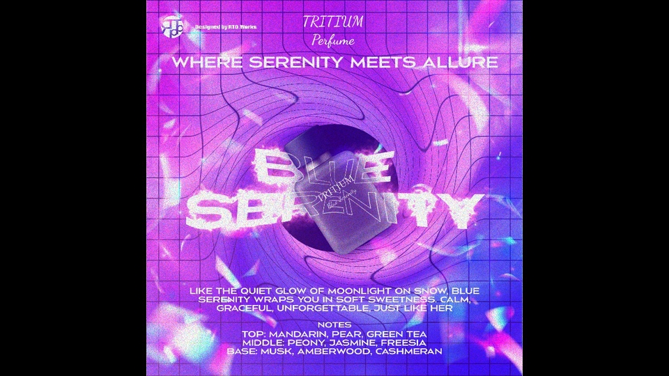 Saya membuat desain visual untuk parfum premium bernama Blue Serenity dari brand Tritium Perfume. Konsep yang saya angkat adalah futuristik-retro dengan nuansa tenang dan elegan, menggambarkan keseimbangan antara ketenangan dan daya tarik. Desain ini menggunakan warna dominan ungu dan biru neon dengan efek glitch, grid, dan grain untuk menciptakan suasana dreamy namun modern. Font glowing dan layout berpusat pada botol parfum memberikan fokus kuat pada produk utama. Bagian tagline, deskripsi aroma, dan notes disusun agar tetap rapi dan mudah dibaca, memperkuat identitas visual yang calm, classy, dan unforgettable. Software used: Alight Motion Design focus: Marketing visual, aesthetic composition, and product branding.