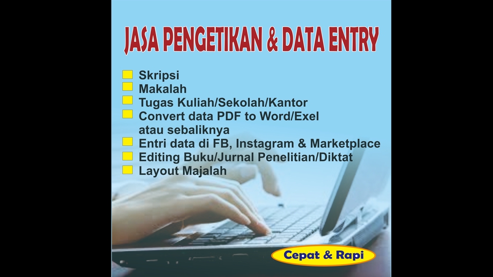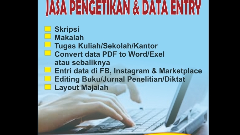 Kami melayani jasa: 1. Pengetikan makalah, skripsi/tesis/disertasi, tugas sekolah/kuliah/kantor. 2. Isi nama e-sertifikat secara otomatis 3. Editing buku/jurnal ilmiah/diktat 4. Entry data ke Exel/FB/Instagram/Marketplace 5. Layout majalah dengan format .cdr/.pdf/.jpg/,png 6. Penyusunan presentasi Power Point Langkah Pekerjaan 1. Bersama klien membahas detil pekerjaan (jumlah pengetikan/editing/entry data/layout majalah) 2. Menentukan lamanya pekerjaan 3. Menyepakati harga/nilai pekerjaan 4. Mulai mengerjakan 5. Mengirim hasil pekerjaan kepada klien 6. Klien memberikan revisi (jika ada) 7. Pekerjaan selesai