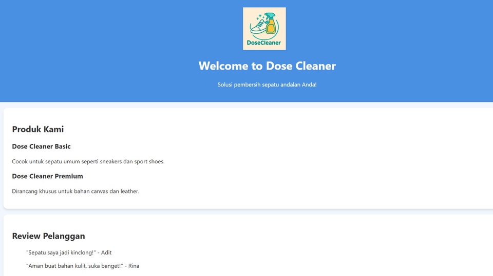 DoseCleaner adalah brand lokal yang memproduksi cairan pembersih sepatu dengan dua varian: Shoes Cleaner Basic dan Shoes Cleaner Premium. Website ini dirancang untuk menampilkan produk secara menarik sekaligus menjadi media promosi dan penjualan online. 💻 Fitur & Teknologi Website: ✅ Landing Page Cerah & Playful – sesuai dengan karakter brand muda dan enerjik ✅ Desain Responsif – nyaman dilihat di mobile maupun desktop ✅ Galeri Produk – menampilkan perbedaan visual antara varian Basic & Premium ✅ Testimoni Pelanggan – meningkatkan kepercayaan calon pembeli ✅ Formulir Order Langsung – memudahkan calon pelanggan memesan produk ✅ Dashboard Admin (Optional) – untuk melihat data lokasi pemesan (fitur tracking) ✅ Backend dengan Node.js – efisien dan scalable ✅ Frontend HTML/CSS terpisah – struktur rapi dan mudah dikembangkan 🎯 Tujuan Website: Meningkatkan kepercayaan konsumen terhadap brand lokal Menjadi media promosi dan informasi produk Menyediakan solusi pembelian langsung tanpa marketplace Website ini dibangun dengan fokus pada kemudahan navigasi, tampilan bersih, dan pengalaman pengguna yang optimal, terutama untuk anak muda dan komunitas sneakerhead.