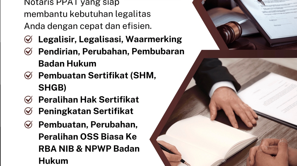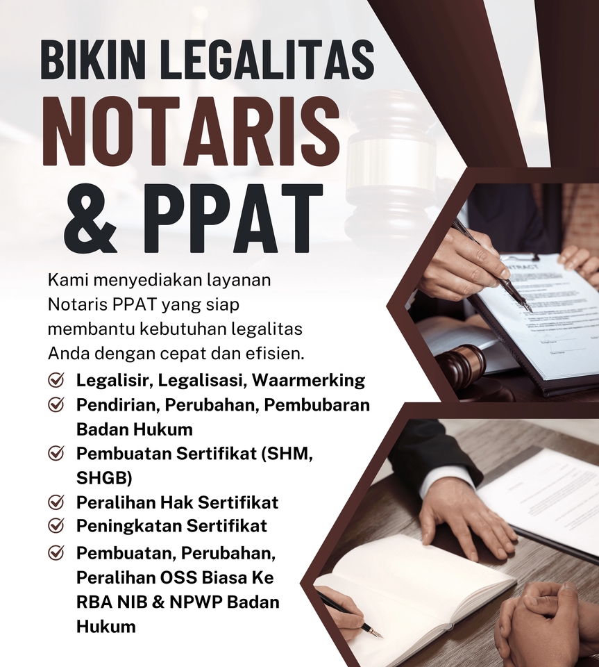 Jasa Bikin Legalitas Notaris & PPAT, kami menyediakan layanan Notaris & PPAT dengan cepat dan Efisien. - Legalisasi, Legalisir dan Waarmerking - Pendirian, Perubahan, dan Pembubaran Badan Hukum - Pembuatan, Peningkatan, Peralihan Sertifikat (SHM, SHGB) - Pembuatan, Perubahan, Peralihan OSS RBA Badan Hukum - NPWP Badan Hukum