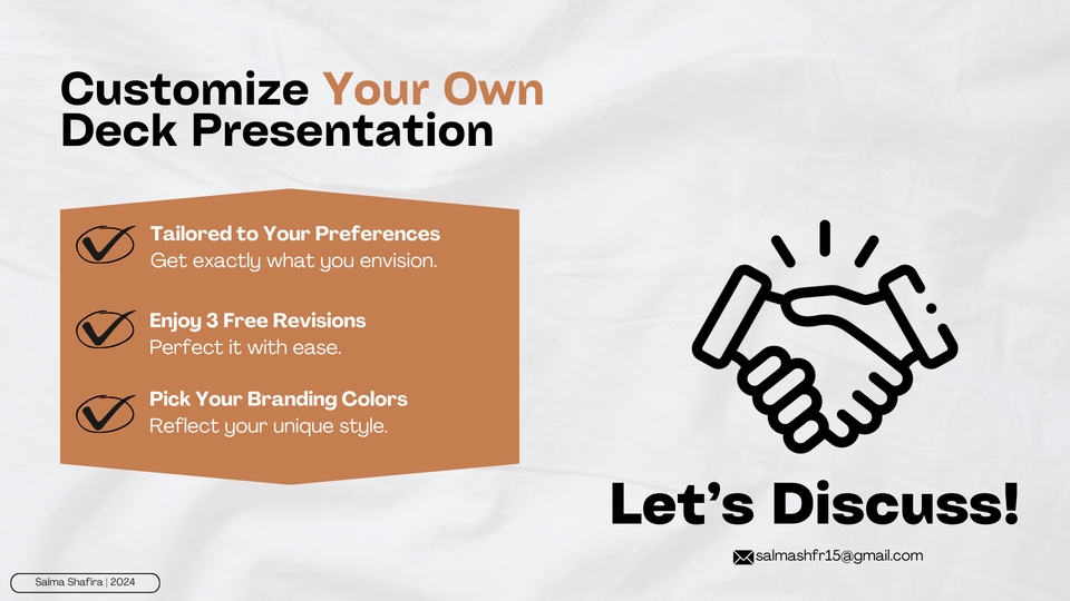 Jasa Desain Presentasi Jenis Deck Presentasi: - Professional Deck - Branding - Pitch Deck - Event & Project Proposal - Creative Portfolio - Presentasi Webinar / Seminar - Presentasi Skripsi - Customized Deck Presentation - Dan lain-lain Notes: Harga yang tertera belum termasuk add on services* *Pengembangan konte/isi dan copywriting, Langkah Pekerjaan 1. Pengiriman materi atau brief 2. Diskusi 3. Pembayaran 4. Review & Revisi (jika ada) 5. Final