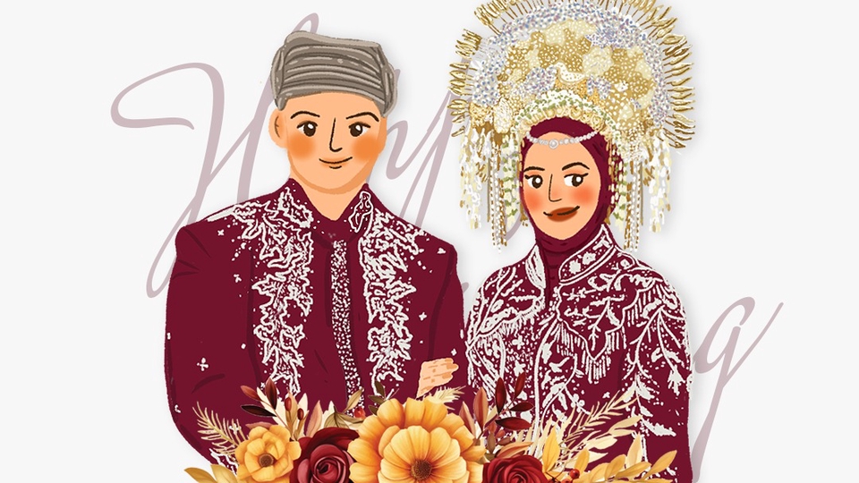 Abadikan momen spesial pernikahanmu dalam ilustrasi yang penuh makna. Dengan sentuhan artistik yang unik, kami akan mengubah kisah cintamu menjadi karya seni yang indah dan tak terlupakan. Ilustrasi pernikahan custom kami akan menjadi kenang-kenangan berharga yang bisa kamu pajang di rumah atau dijadikan hadiah istimewa. Langkah Pekerjaan 1. Request design dari client (diskusi referensi image, moodboard warna, serta adat yang diinginkan) 2. proses pengerjaan design 1 hari (sesuai antrian) 3. Proses acc design (penyesuaian dan revisi design) 4. Proses pengerjaan revisi (1 hari jika revisi mayor) 5. Proses acc dan finalisasi desain 6. Proses submit desain kepada client