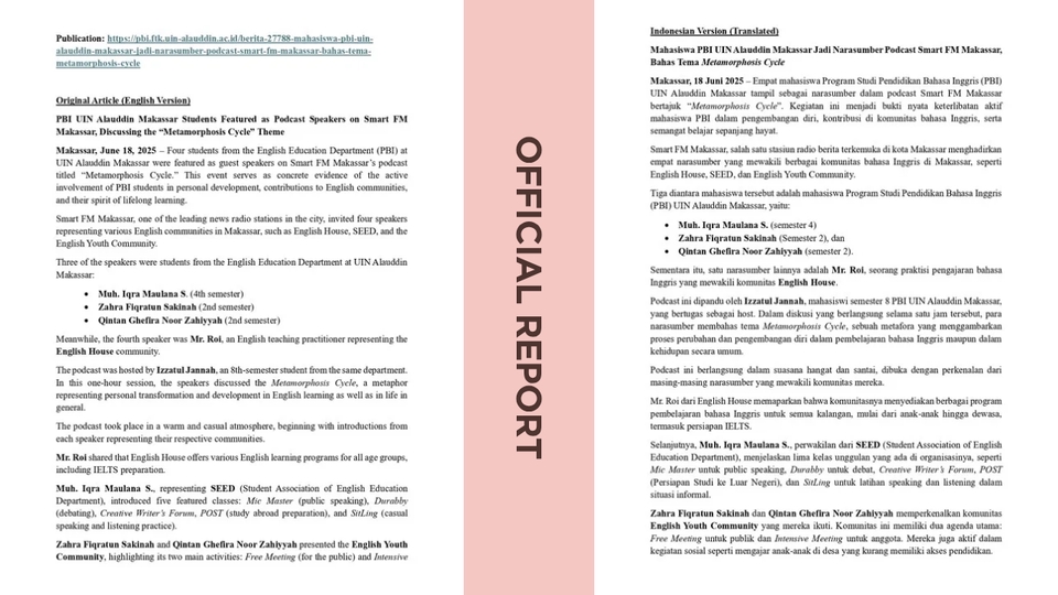 Halo! Saya Salsa, mahasiswi program studi Pendidikan Bahasa Inggris dengan pengalaman menerjemahkan berbagai jenis teks dari Bahasa Inggris ke Bahasa Indonesia dan sebaliknya. Saya memiliki sertifikat TOEFL sebagai bukti kemampuan Bahasa Inggris saya, khususnya dalam konteks akademik maupun profesional. Selain itu, saya menggunakan bantuan CAT Tool (MateCAT) untuk menjaga konsistensi, ketepatan, dan kualitas terjemahan. Saya menyediakan jasa terjemahan untuk segala jenis teks sesuai kebutuhan Anda. Semua hasil terjemahan sudah termasuk proofreading dan dapat direvisi hingga 2 kali jika diperlukan. Catatan: dokumen legal (akta, surat perjanjian, dll.) tidak termasuk. Dengan latar belakang di bidang bahasa, saya terbiasa menggunakan berbagai gaya penulisan mulai dari formal, informal, akademis, teknis, jurnalistik, maupun kreatif sehingga terjemahan dapat disesuaikan dengan kebutuhan Anda. Jika ada pertanyaan atau kebutuhan khusus, jangan ragu untuk menghubungi saya. Saya siap membantu sesuai kebutuhan Anda.