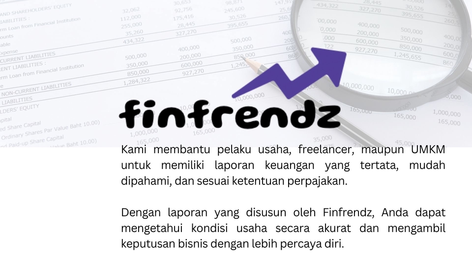 Saya adalah seorang profesional yang berfokus membantu UMKM, freelancer, dan pelaku usaha menata pembukuan dan perpajakan dengan pendekatan yang praktis dan mudah dimengerti. Melalui Finfrendz, saya ingin menjadi teman keuangan yang dapat diandalkan — bukan hanya mencatat angka, tetapi memberikan insight yang membantu bisnis Anda berkembang. Layanan • Pembukuan dan pencatatan transaksi • Laporan keuangan (Laba Rugi, Neraca, Arus Kas) • Rekonsiliasi dan pemeriksaan data • Perhitungan & rekap pajak (PPh 21, 23, Final, PPN) 🪄 Semua layanan dapat disesuaikan dengan kebutuhan usaha dan skala bisnis Anda. ✅ Revisi tanpa batas selama 1 bulan ✅ Laporan rapi dan mudah dipahami ✅ Komunikasi sopan dan cepat tanggap ✅ Data dijaga kerahasiaannya ✅ Format fleksibel (Excel, PDF, Google Sheets) ✅ Bonus template laporan keuangan ✅ Insight singkat tentang kondisi usaha Anda Dengan Finfrendz, Anda tidak hanya mendapat laporan, tetapi juga ketenangan dalam mengelola keuangan bisnis.