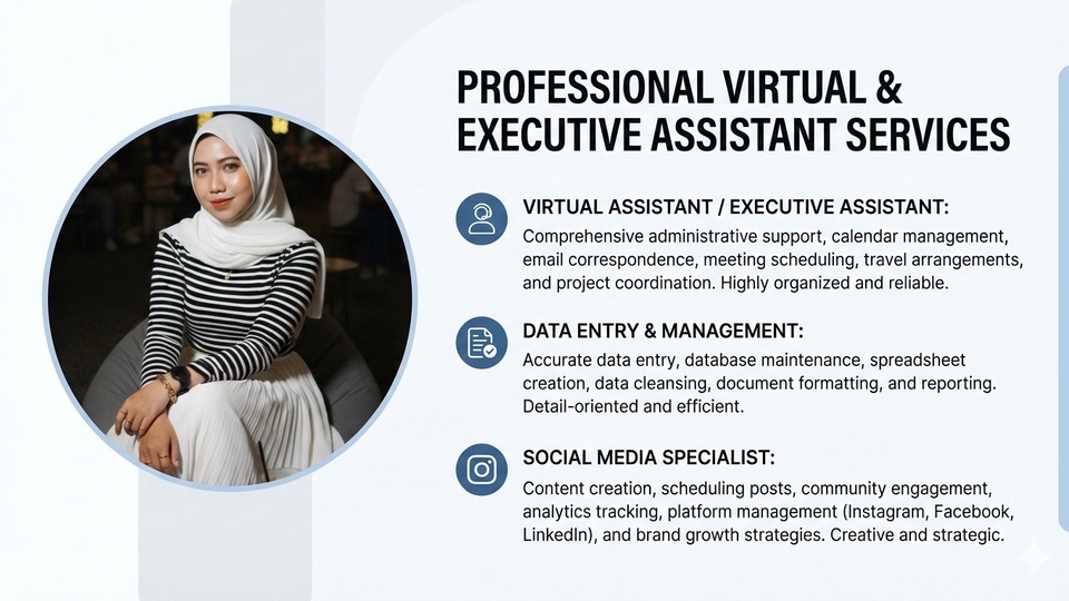 Ruang Lingkup Pekerjaan Virtual Assistant / Executive Assistant • Manajemen email & kalender • Penjadwalan meeting & reminder • Follow-up klien & vendor • Pengaturan dokumen & file • Online research • Koordinasi perjalanan • Administrasi harian • Penanganan data rahasia Data Entry • Input data (Excel, Google Sheets, CRM, dll) • Data cleaning & formatting • Konversi PDF ke Excel/Word • Copy-paste tasks • Database update • Product listing Social Media Support • Penjadwalan konten • Penulisan caption • Manajemen DM & komentar • Hashtag research • Basic content planning • Engagement audiens • Laporan performa sederhana ⸻ Pengalaman & Keahlian • 15+ tahun pengalaman sebagai Executive & Personal Assistant • Sangat terorganisir & detail-oriented • Cepat belajar & proaktif • Menjaga kerahasiaan & profesionalitas • Terbiasa bekerja mandiri • Memahami kebutuhan pemilik bisnis • Komunikasi jelas & responsif ⸻ Langkah Kerja 1. Diskusi kebutuhan & tujuan klien 2. Pengumpulan informasi 3. Menyusun alur kerja 4. Mulai pekerjaan dengan update rutin 5. Review & revisi jika diperlukan 6. Finalisasi pekerjaan ⸻ Persyaratan dari Klien Agar pekerjaan berjalan lancar, saya membutuhkan: • Instruksi yang jelas • Deadline yang disepakati • Akses tools (jika diperlukan) • Format contoh (jika ada) • Brand guideline (untuk social media)