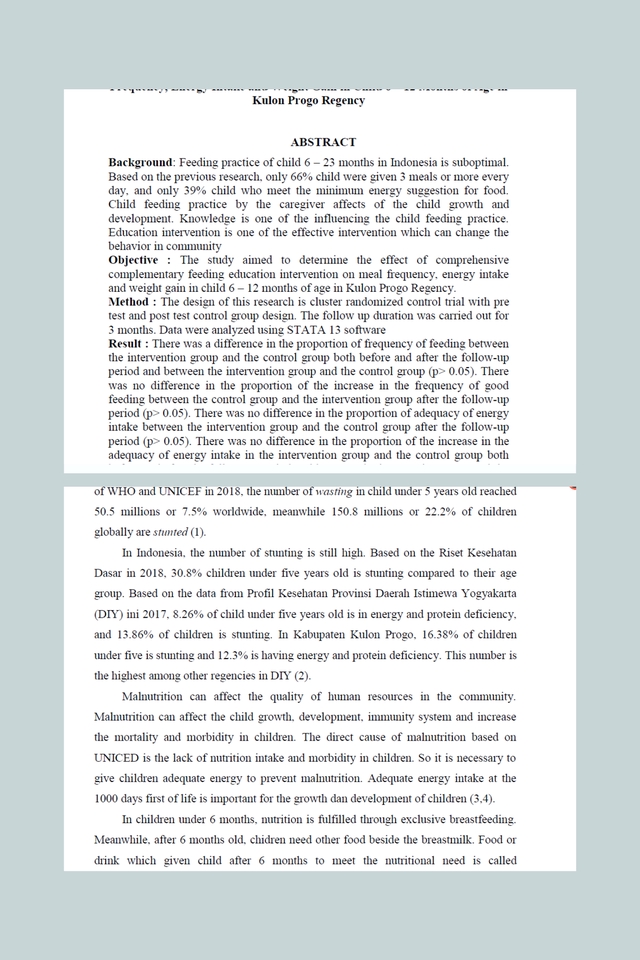 I'm experienced in data and research the health-related fields, I have been in some research activities and community services in health-related fields since 2015 till now. I can speak in English actively (TOEFL ITP score: 590), able to use Microsoft Office programs, able to use Corel Draw and Canva, able to use nutrition-related software (Nutrisurvey, WHO Anthro, WHO AnthroPlus)