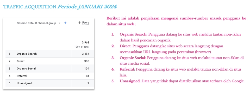Rp350,0 rbReport Traffic Website meliputi : 1. Acquistion 2. Engagement 3. Demography 4. Technology Periode cutoff 1 month. Output PDF/PPT Based on request client.