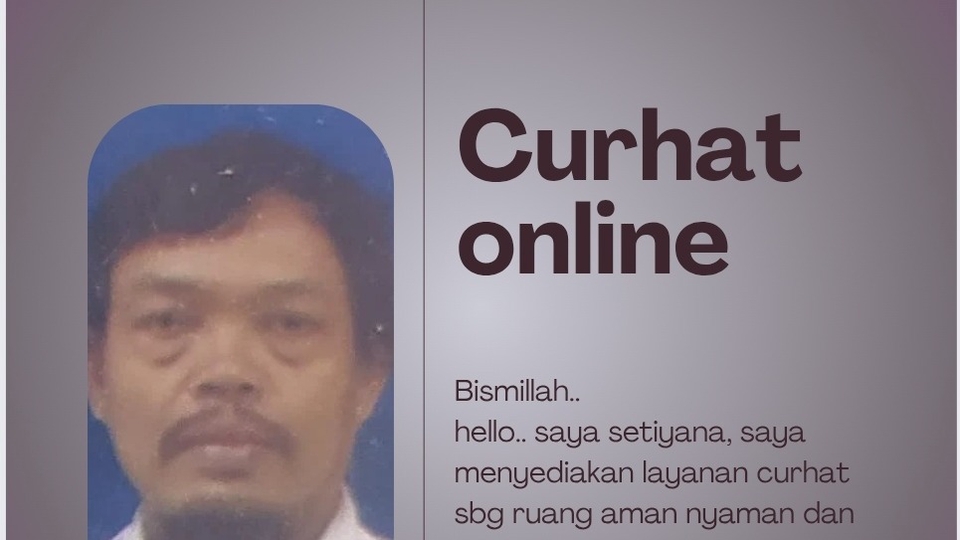 Bismillah.. Hello saya setiyana, menyediakan jasa curhat online sbg ruang yg aman nyaman amanah terjaga kerahasiaannya bagi siapapun yg membutuhkan..