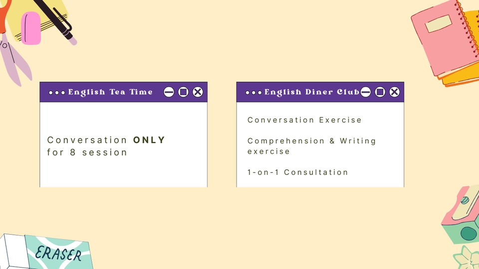 Rp500,0 rb- Conversation for 8 session - Extra comprehension + writing techniques - Cover letter & CV making - EXTRA 1on1 consult